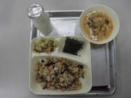今日は牛肉のきんぴらちらし、みそ汁、キャベツの赤じそあえでした。赤じそはさわやかな香りがあり、こい赤紫色をしています。赤じそは主に梅干しの色づけやしそジュースなどに使われています。今日は給食試食会があり、子どもと同じものを14名の保護者の方にも食べていただきました。