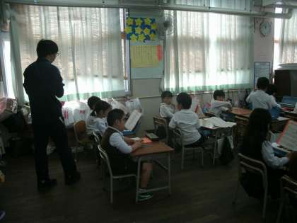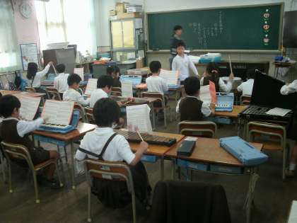 1年2組は、音楽の学習をしていました。「ミッキーマウスマーチ」の合奏練習をしています。けんばんハーモニカのほかに、鉄琴、木琴、小太鼓などの楽器も加わっていました。
