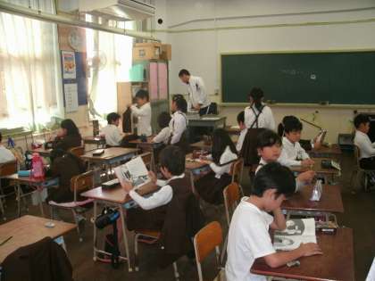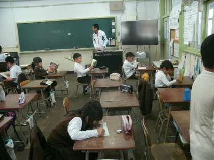 2年1組は、漢字テストが終わったところでした。早く書き終えた人は読書をしていました。