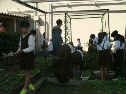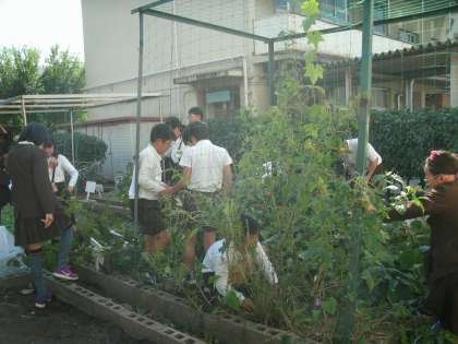 5年生は、理科の学習をしていました。種まきをするために学習園の整備をしています。