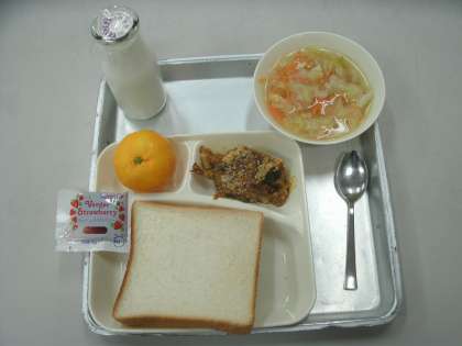 今日の給食は、なすのミートグラタン、鶏肉と野菜のスープ、みかん、食パン、いちごジャム、牛乳です。