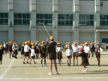 「だるまさんが転んだ」「大縄跳び」「十字鬼」など班で考えた遊びを仲良く楽しんでいました。高学年の児童は低学年の児童にやさしく遊びのルールを説明していました。