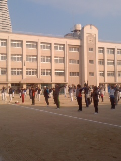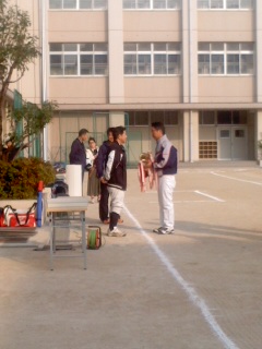 8時30分、市岡中学校での開会式の様子です。昨年度の優勝チームが優勝杯の返還を行いました。その後、参加者全員で準備運動をしてそれぞれの会場校に分かれました。