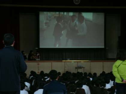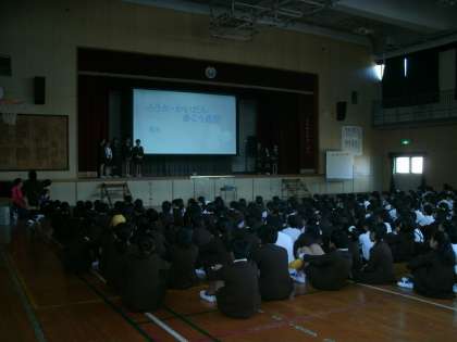 児童朝会の後半は、計画委員会による発表でした。「廊下・階段は走らず右側を正しく歩こう。」と計画委員会のメンバーが啓発ビデオを作成しました。廊下や階段を安全に歩く極意を2人の忍者が伝授するというストーリーです。