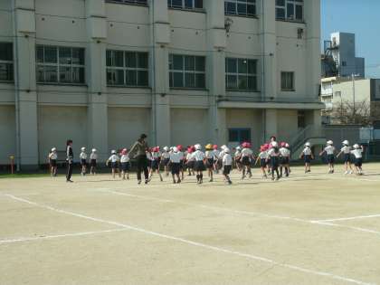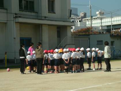1年生は、運動場で体育の学習をしていました。体育係さんが前に出て、はきはきとした声で号令をかけ、準備運動をしていました。