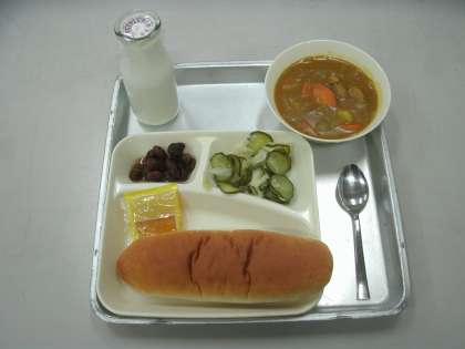 今日の給食は、豚肉と野菜のカレー煮、サワーサラダ、うずら豆のグラッセ、コッペパン、アプリコットジャム、牛乳です。
