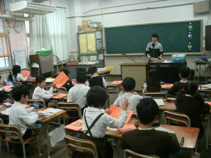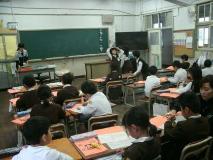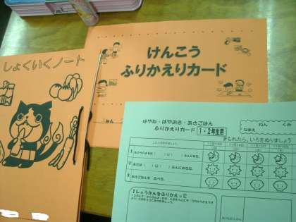 1年2組は、来週から始まる「早寝・早起き・朝ごはん週間」のふりかえりカードを台紙にはっていました。