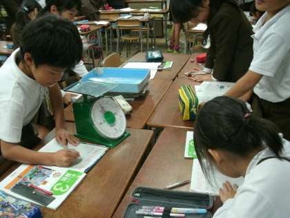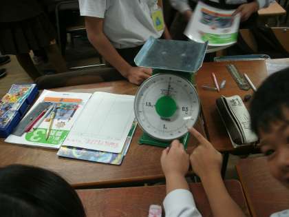 3年生は、算数の学習をしていました。はかりを使っていろいろな物の重さをはかっていました。はじめに予想をたててから実際にはかります。