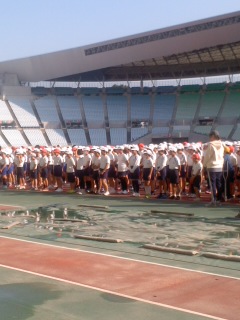 6年生は長居競技場でスポーツ交歓会に参加しています。開会式の様子です。