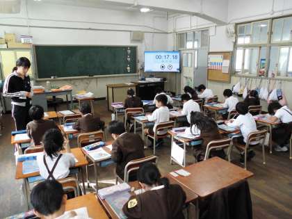 1年2組は、制限時間内に計算問題が何問できるのか「けいさんマラソン」をしていました。そのあとは、繰り下がりのある引き算の計算の仕方についてみんなで考えました。