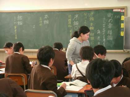 6年生は、国語「町の幸福論」の学習をしていました。序論・本論・結論の3つに段落分けをしています。グループで意見を出し合って考えていました。