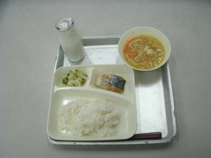 今日の給食は、さごしのおろししょう油かけ、けんちん汁、小松菜と白菜の甘酢和え、ごはん、牛乳です。