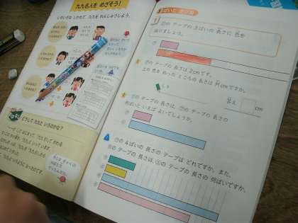 2年1組は、算数の学習をしていました。テープに色をぬって、倍とかけ算の学習をしていました。