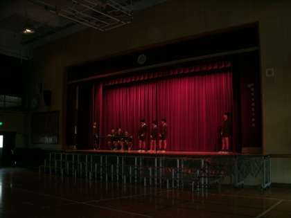 6年生は、体育館で劇「本当の宝物」の練習をしていました。ステージ上の演技だけでなく、スポットライトなどの照明係も自分たちで役割分担して活躍していました。