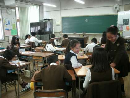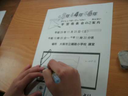 4年1組は、学習発表会の案内状に絵を描いて色をぬったり、メッセージを書き込んだりしていました。案内状は来週持ち帰りますので、楽しみになさってください。