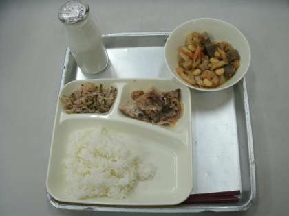 今日の給食は、豚肉のごまだれ焼き、大豆の煮もの、切り干し大根のしそ甘酢づけ、ごはん、牛乳です。