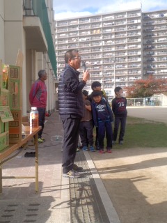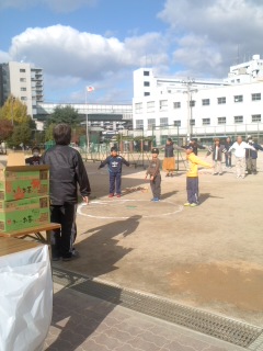 13時から運動場でグランドゴルフ大会が開催されました。開会式と準備体操の様子です。