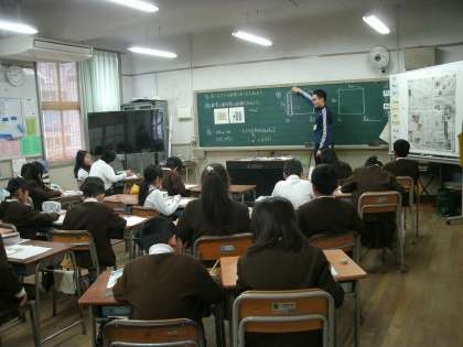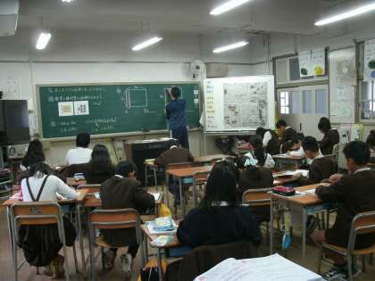 4年1組は、算数の「広い面積の表し方を知ろう」を学習していました。教室と理科室の床面積の求め方を考えていました。黒板横のホワイトボードには縦1m、横1mの大きさの新聞紙が掲示してありました。1平方メートルの大きさを視覚的に意識させています。