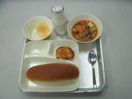 今日の給食は、牛肉のケチャップ煮、変わりピザ、白桃(缶)、黒糖パン、牛乳です。