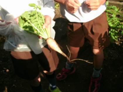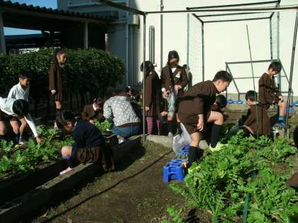 3年生は、学習園で総合的な学習の時間の学習をしていました。3年生は「なにわの伝統野菜」を育てています。今日は、田辺大根の間引きをしていました。