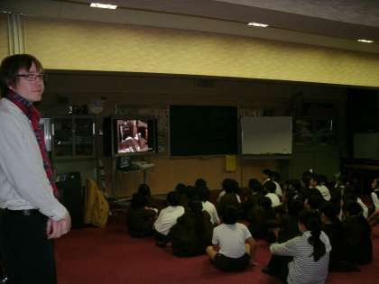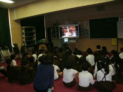 3年生は、多目的室で外国語の学習をしていました。映像を観ながらC−NETの先生の質問に答えていました。