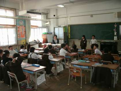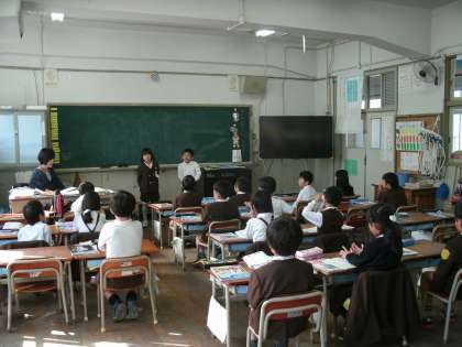 1年1組は、朝の会をしていました。日直さんが前に出て上手に朝の会を進行していました。