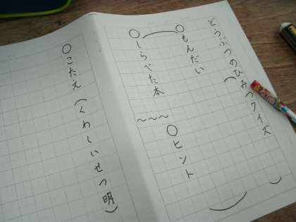 2年1組は、国語テストの後、「どうぶつのひみつクイズ」を考えていました。