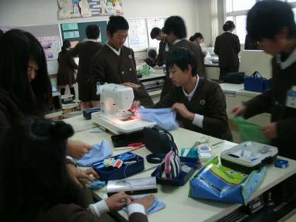6年生は、家庭科室にいました。お弁当箱を入れる袋が、ほぼ完成しました。後はひもを通すだけの児童もいました。