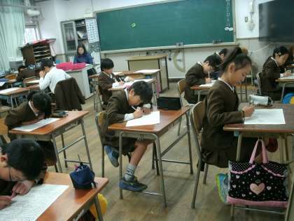 4年2組は、国語のテストをしていました。「世界一美しいぼくの村」のテストです。