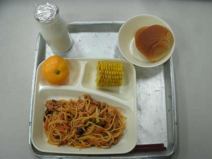 今日の給食は、きのこスパゲッティ、焼きとうもろこし、みかん、黒糖クレセントロールパン、牛乳です。