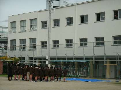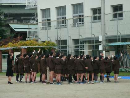 校舎3階の窓からカメラマンさんの合図で集合写真を撮影している様子です。