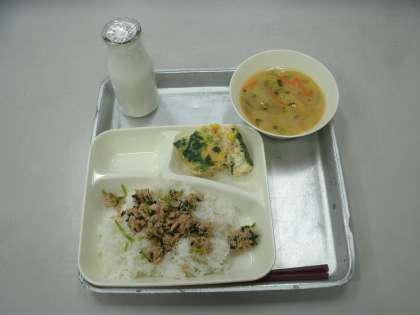 今日の給食は、千草焼き、みそ汁、ツナっ葉いため、ごはん、牛乳です。