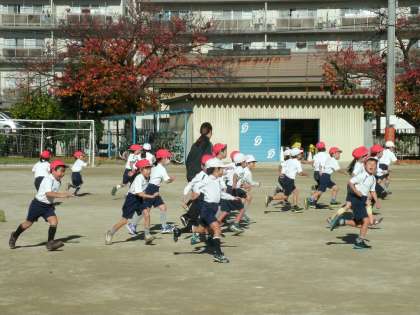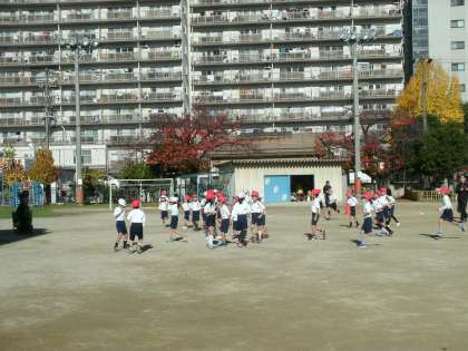 1年生は、冷たい風の中、元気に運動場で体育をしていました。