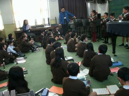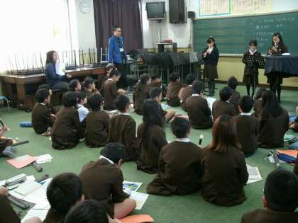 4年生は、音楽室にいました。順番にみんなの前で「ジングルベル」をリコーダーで演奏していました。暗譜ができているか、スラスラとなめらかに演奏できるか、タンギングができているかなどの観点がチェックされます。