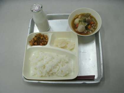 今日の給食は、鶏肉と野菜の煮物、じゃこ豆、かぶのゆず風味、ごはん、牛乳です。