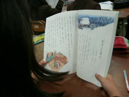 2年1組は、国語の学習をしていました。「かさこじぞう」を学習していました。担任の先生の範読を聴いていました。
