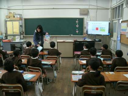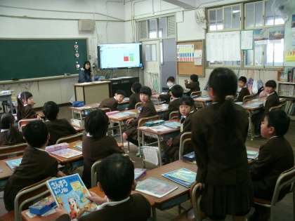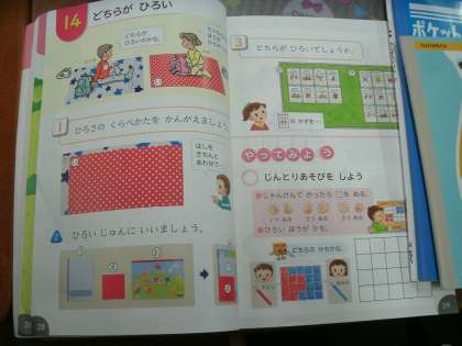 1年2組は、算数の学習をしていました。「どちらがひろい」の学習で広さ比べをしていました。