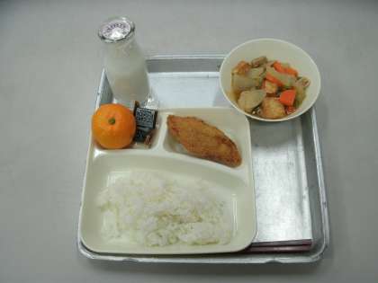 今日の給食は、まぐろのフライ、豚肉とあつあげの煮もの、みかん、ごはん、牛乳です。