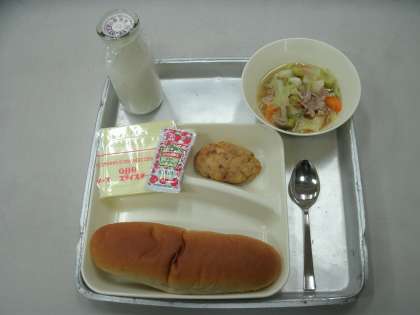今日の給食は、とうふハンバーグ、スープ煮、スライスチーズ、黒糖パン、牛乳です。