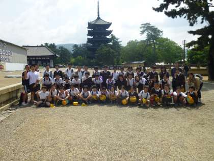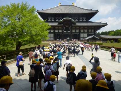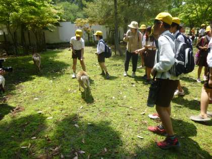 奈良公園では東大寺も見学しましたが、迷子になるのではと思うくらい、観光客や遠足・修学旅行生でいっぱいでした。お弁当を食べた後は広場で遊び、JR奈良駅に帰る途中には鹿に餌もあげました。
