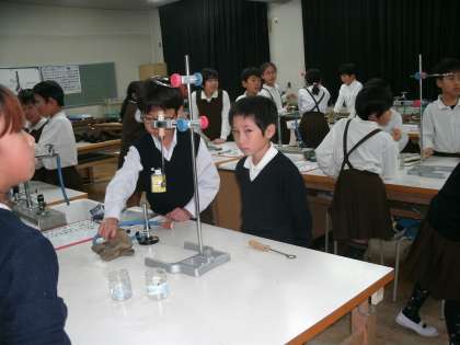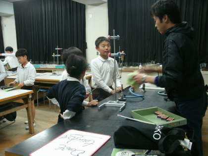 4年2組は理科室で実験をしていました。「金属球を温めると輪の中を通るか」仮説を立てた後実験して確かめていました。