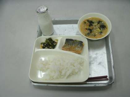 今日の給食は、さばのみぞれかけ、みそ汁、小松菜の炒め物、ごはん、牛乳です。