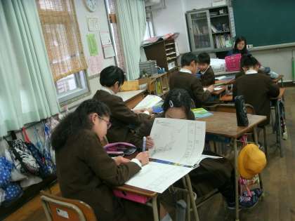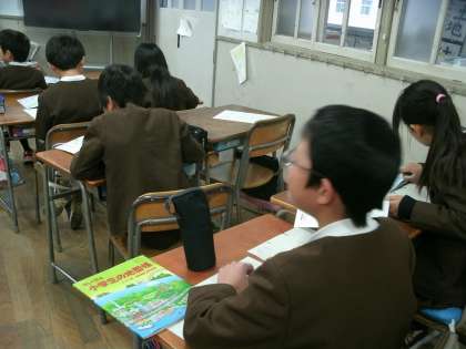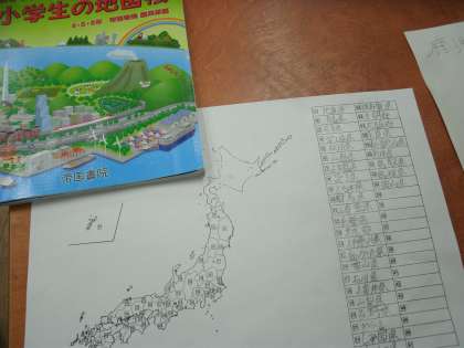 4年2組は、白地図を見ながら都道府県の場所を覚えていました。漢字で正確に書けるように頑張って覚えているところでした。