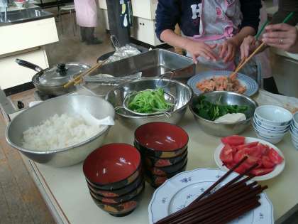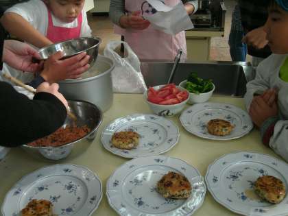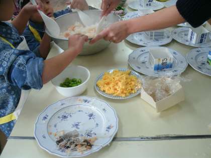 献立は、デコレーション寿司、照り焼きれんこんバーグ、すまし汁です。