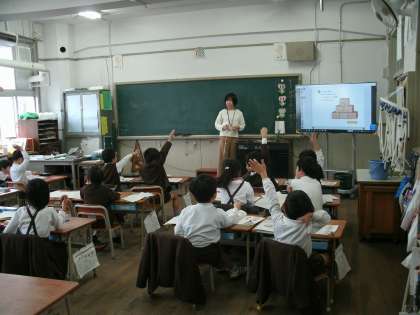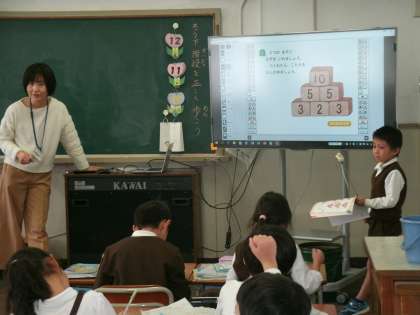 1年1組は、算数の学習をしていました。「けいさんぴらみっど」をしていました。となりどうしの数をたし、答えは上のますに書きます。ピラミッドに最初から書かれている数字を頼りに計算して、空いているますに答えを埋めていきます。