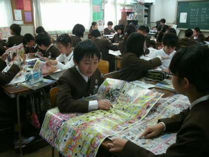 5年生は、社会科の学習をしていました。身のまわりにある工業製品を種類ごとに分けていました。広告のちらしに掲載されている商品の写真を見ながら分類していました。
