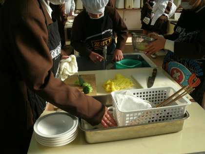 6年生は、家庭科室で調理実習をしていました。粉ふきいもをつくります。ブロッコリーもゆでます。おいしくできることでしょう。「ゆでている間に使い終わった調理器具をきれいに洗っておこう。」と、段取りよく協力して作業をしていました。さすが6年生です。
