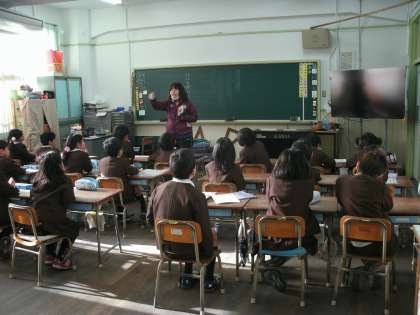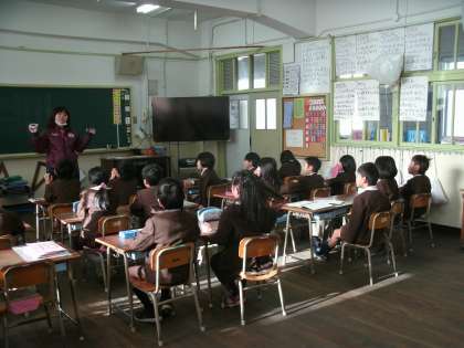 2年2組は、インフルエンザの予防について担任の先生から話をきいていました。各教室に新しくデジタル温湿度計が設置されました。この温湿度計にはインフルエンザ警告表示機能が付いています。教室の換気に注意し、温度・湿度を適度に保つようにしましょう。