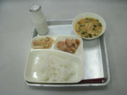 今日の給食は、鶏肉の甘辛焼き、みそ汁、だいこんの煮物、ごはん、牛乳です。