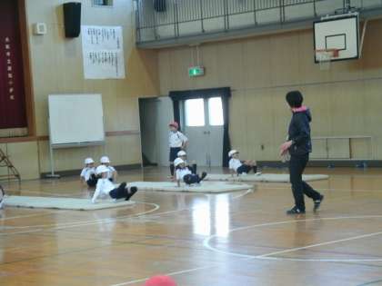 1年生は、体育館でマットあそびをしていました。マットの上で、「くもあるき」や「あざらし」の動きを模倣していました。友だちの動きを見ながら、自分の動きの参考にしていました。工夫した動きを考えていました。